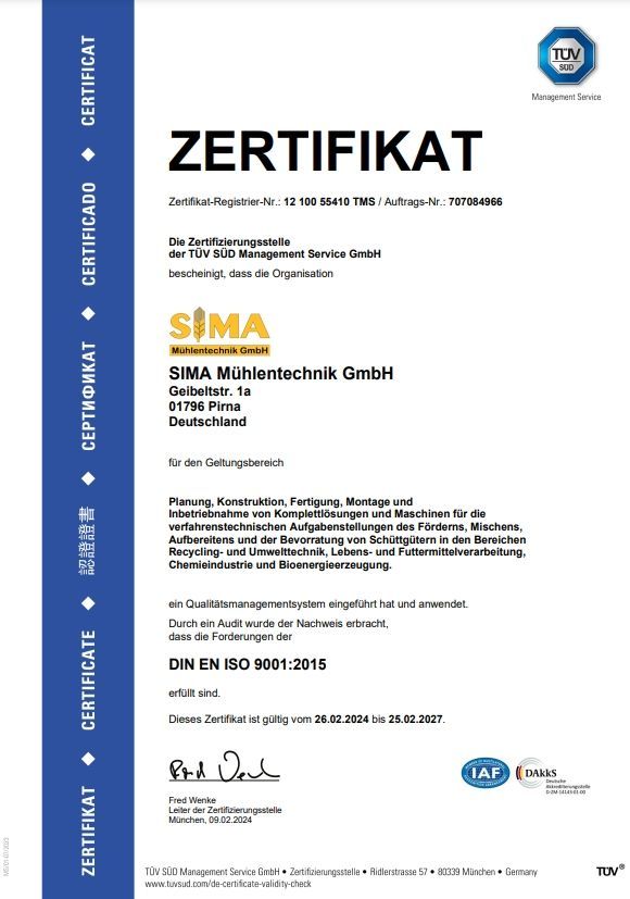 Die SIMA Mühlentechnik GmbH arbeitet nach einem zertifizierten Qualitätsmanagementsystem und erhielt 2018 die ISO 9001:2015 Zertifizierung sowie die Zertifizierung als Schweißfachbetrieb nach DIN EN 1090-2. Damit erfüllt das Unternehmen höchste Standards in Qualität und Fertigung.