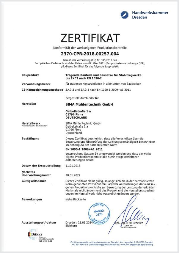 Die SIMA Mühlentechnik GmbH arbeitet nach einem zertifizierten Qualitätsmanagementsystem und erhielt 2018 die ISO 9001:2015 Zertifizierung sowie die Zertifizierung als Schweißfachbetrieb nach DIN EN 1090-2. Damit erfüllt das Unternehmen höchste Standards in Qualität und Fertigung.